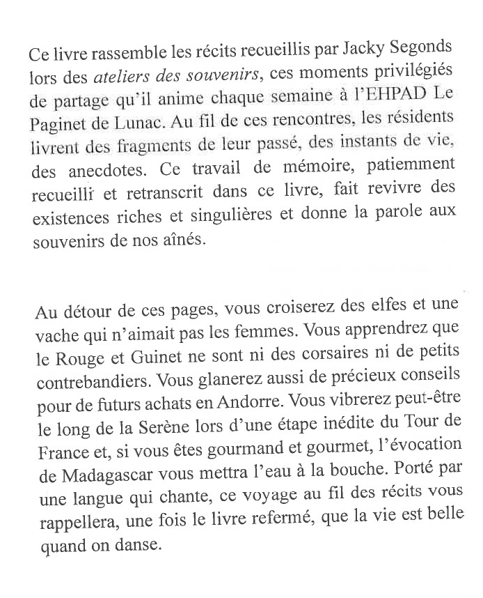 Ce livre rassemble les récits recueillis par Jacky Segonds lors des ateliers souvenirs chaque semaine à l’EHPAD.